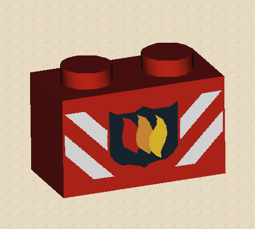 Red Brick 1 x 2 with Fire Logo Badge and White Stripes Pattern